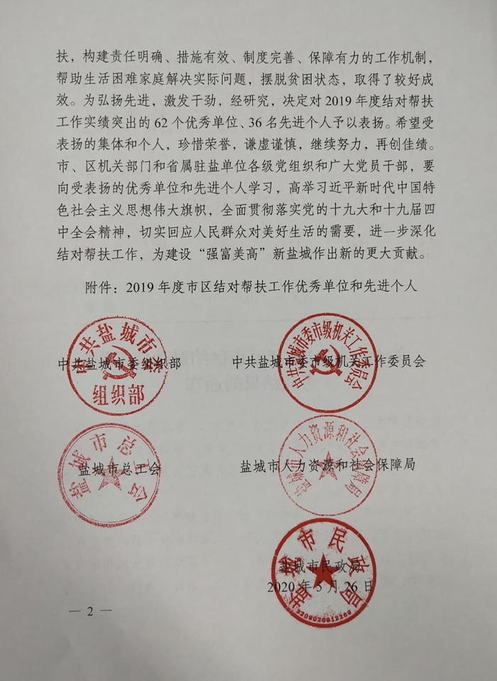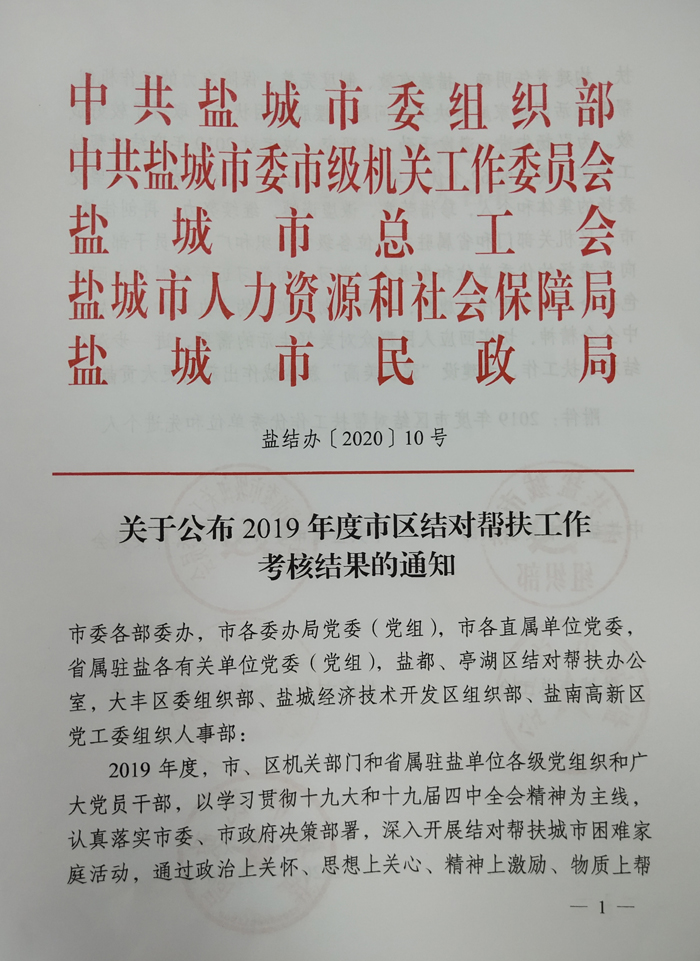 5月26日,中共盐城市委组织部、中共盐城市委市级机关工作委员会、盐城市总工会、盐城市人力资源和社会保障局、盐城市民政局联合下发《关于公布2019年度市区结对帮扶工作考核结果的通知》(盐结办〔2020〕10号),表扬在2019年度深入开展结对帮扶城市困难家庭活动中表现突出的先进集体和先进个人,我校荣获“2019年度市区结对帮扶工作优秀单位”荣誉称号,工会崔振虎同志获“2019年度市区结对帮扶工作先进个人”荣誉称号。