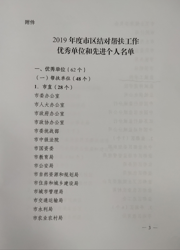 据悉,2020年全市共有62个集体获“2019年度市区结对帮扶工作优秀单位”,38名个人获“2019年度市区结对帮扶工作先进个人”。