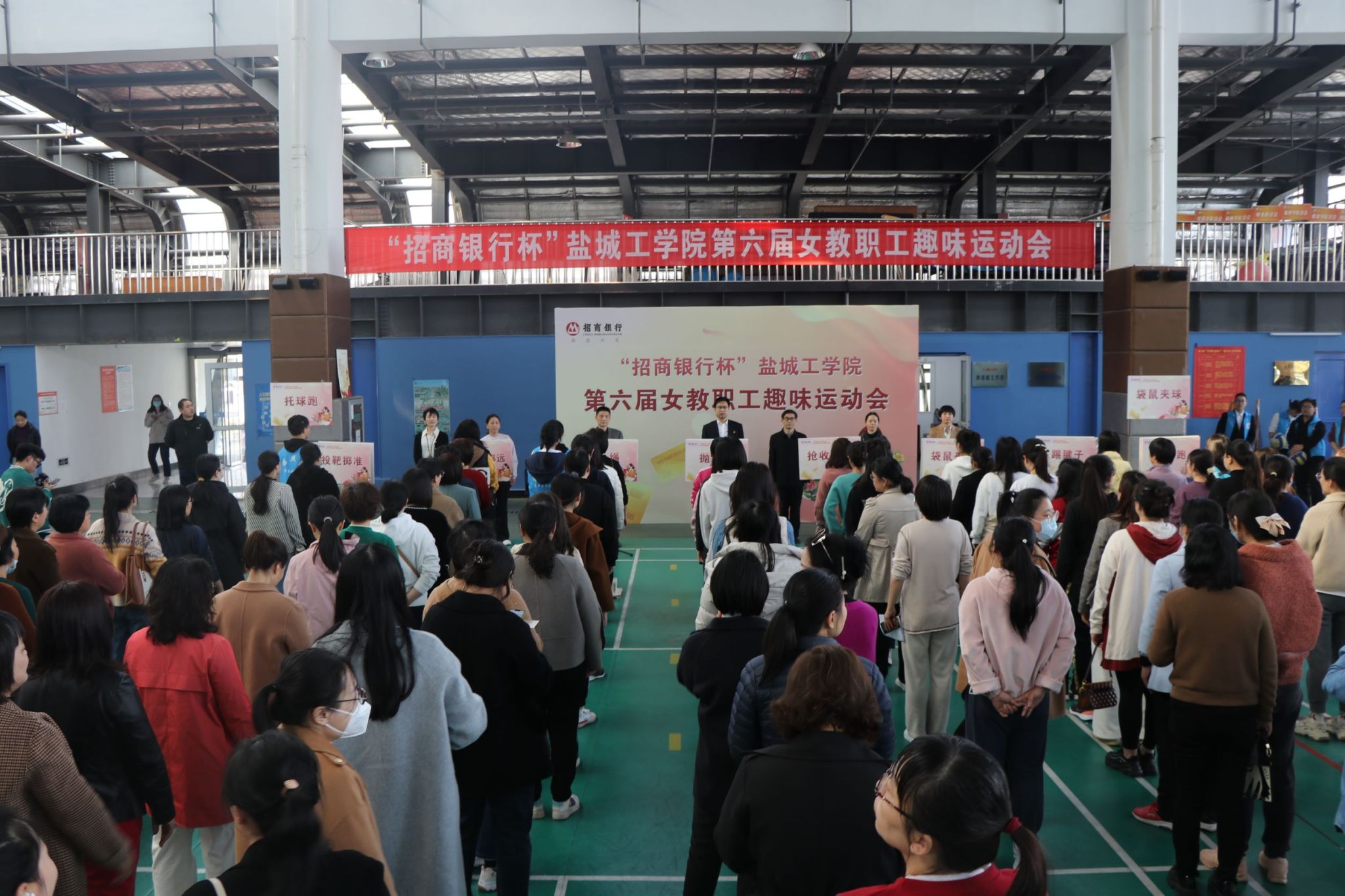 周晓琴致开幕词,指出女教职工们一直是学校建设和发展的中坚力量,她们用情怀和担当为学校的各项事业奉献着自己的青春和智慧。丰富多彩的庆祝活动,让广大女教职工充分感受到学校的关怀和温暖。纪新星代表招商银行盐城分行致辞,裁判长乐晓卉介绍比赛项目和规则,经管学院肖舒语老师代表运动员宣誓,体育学院仲祟霞老师代表裁判员宣誓。谢毅敏宣布“招商银行杯”盐城工学院第六届女教职工趣味运动会比赛开幕。