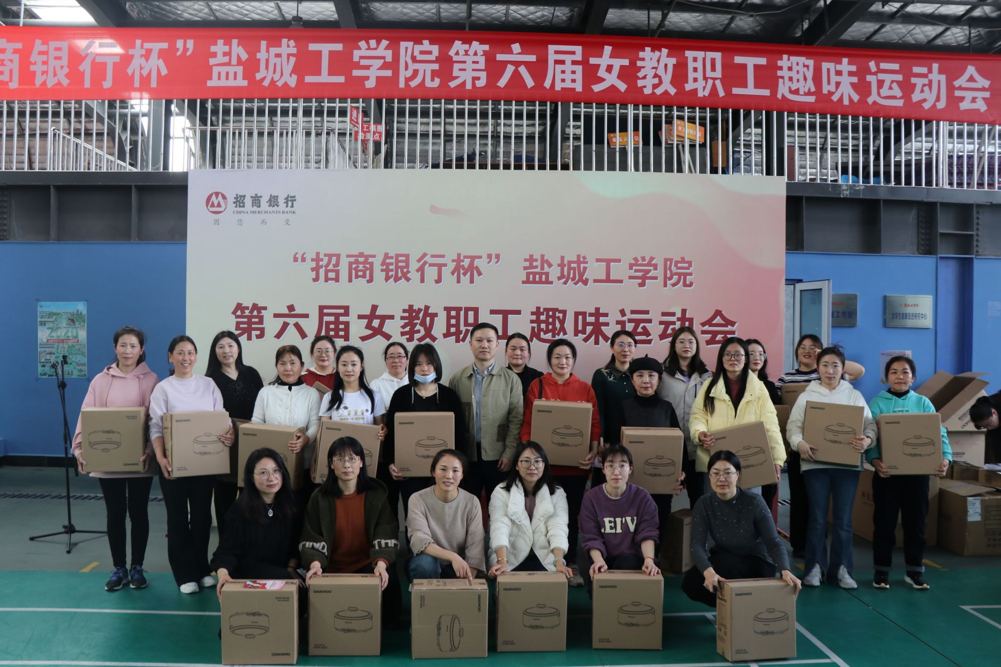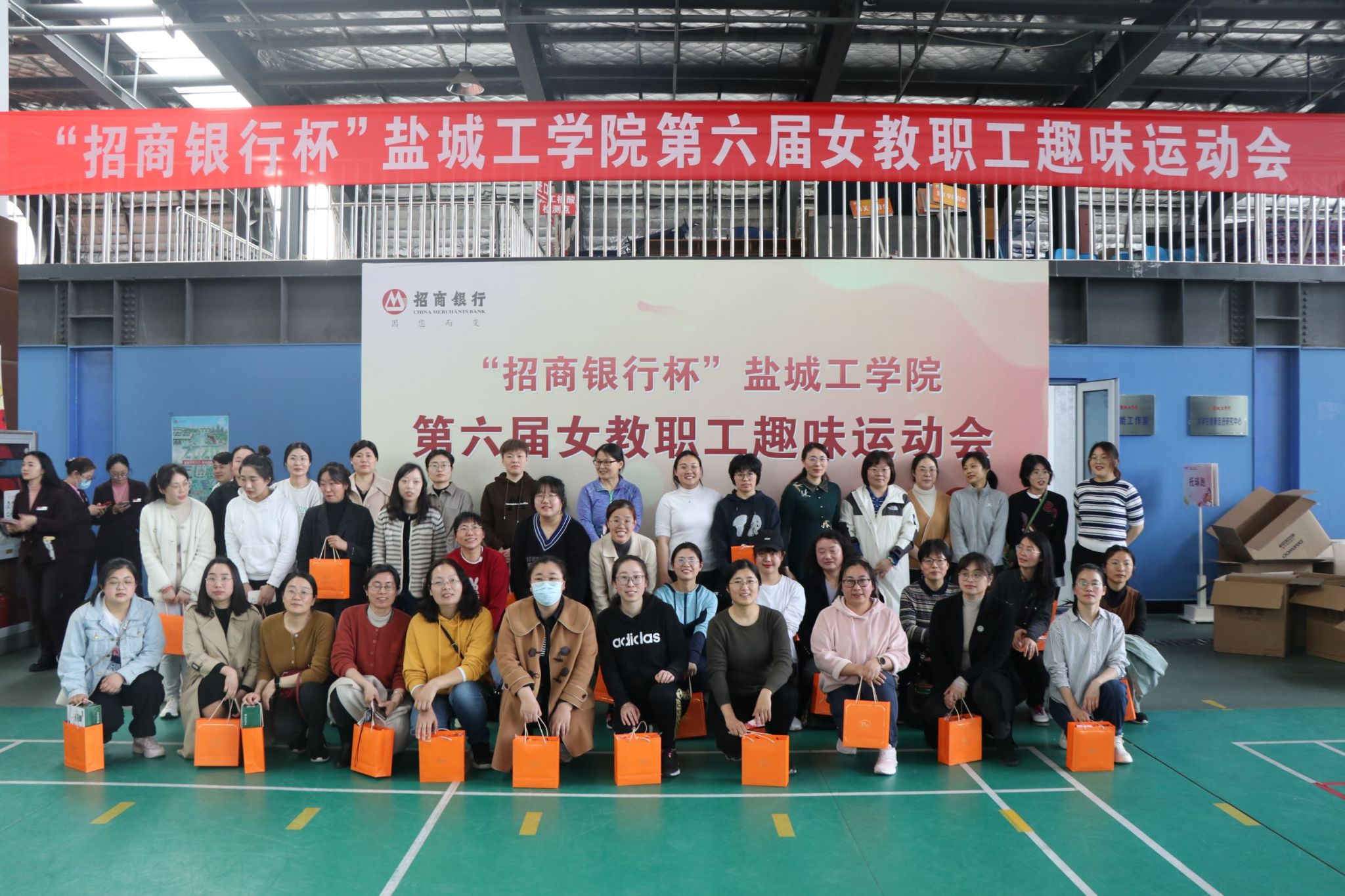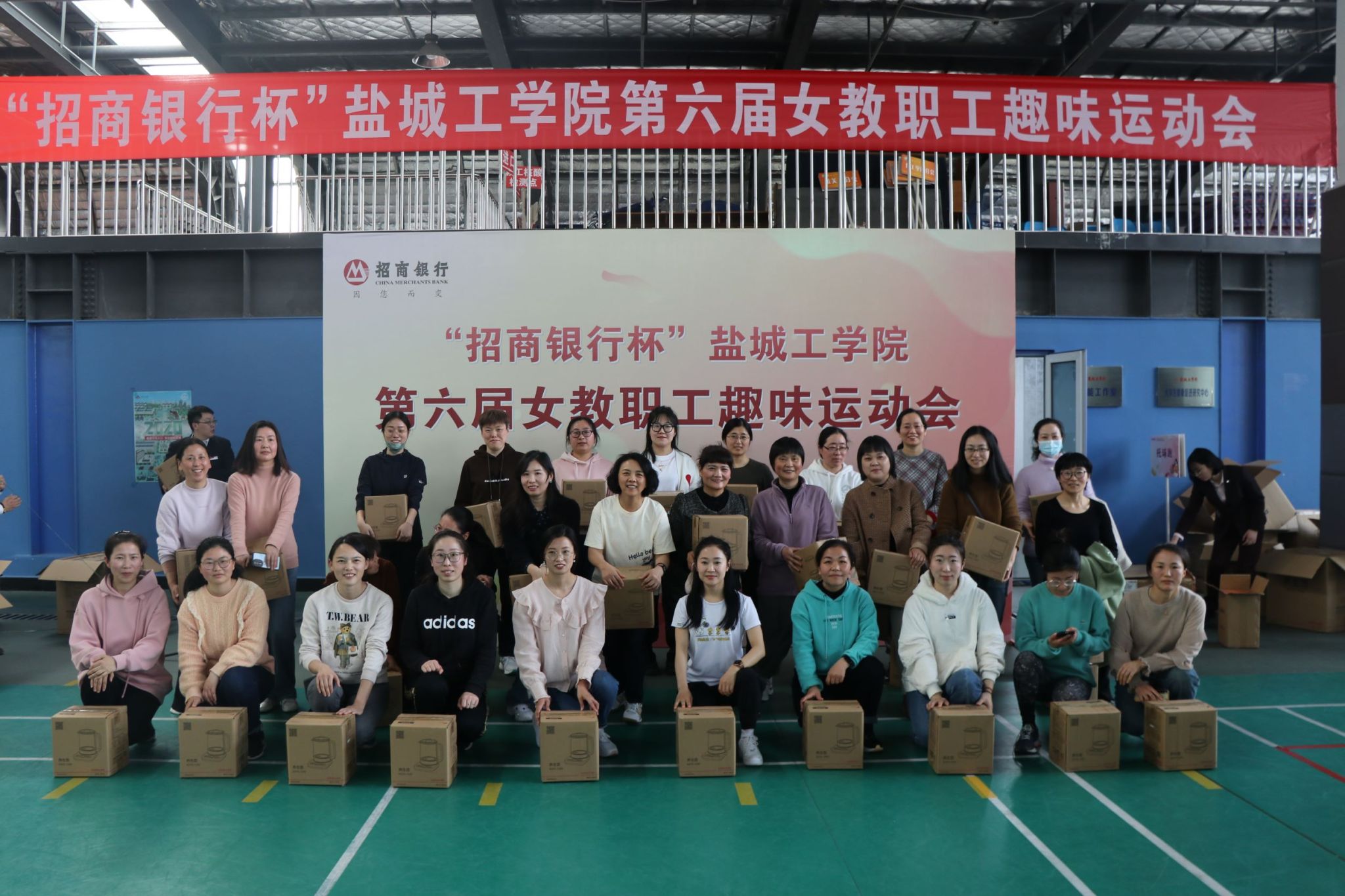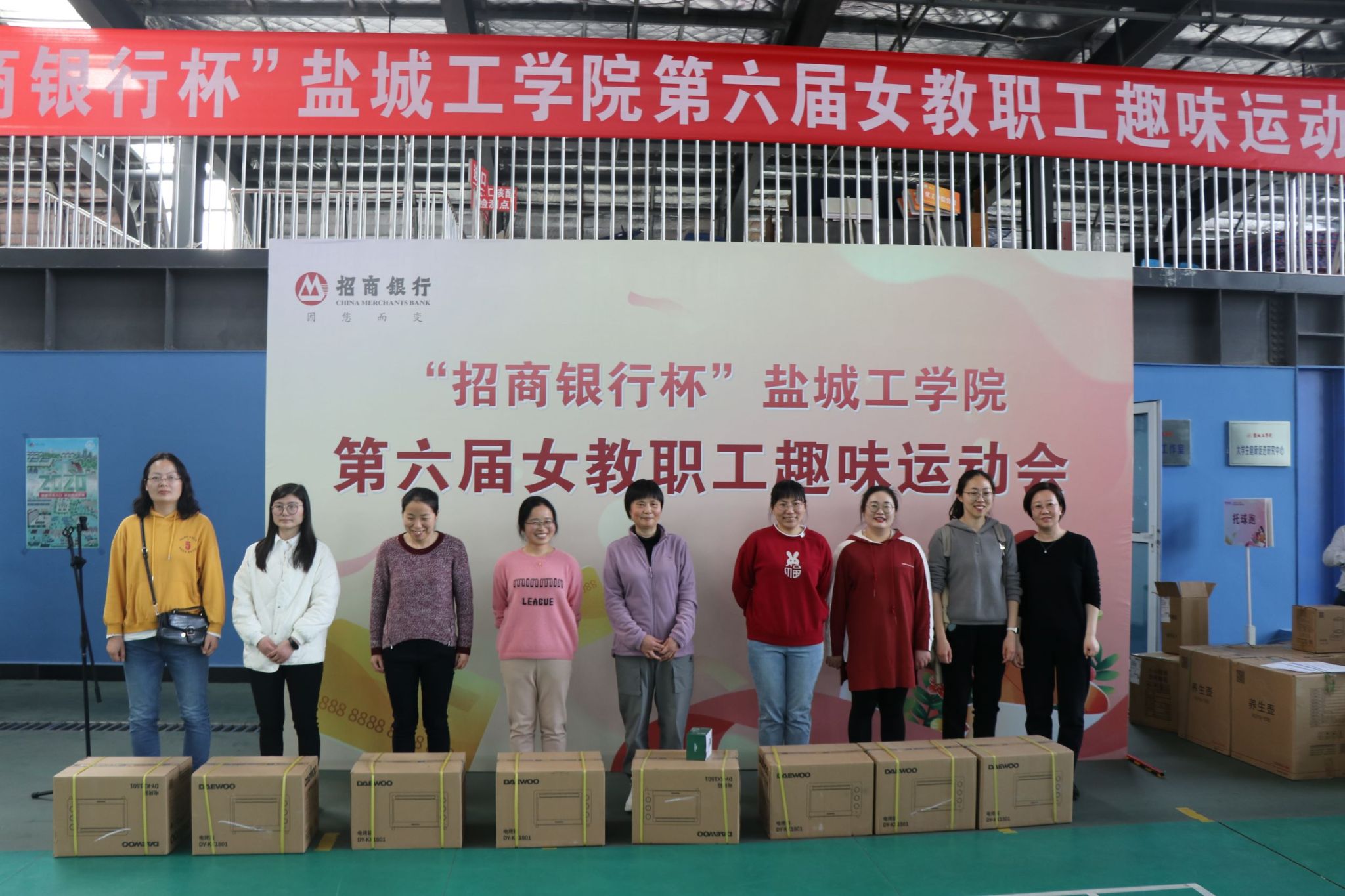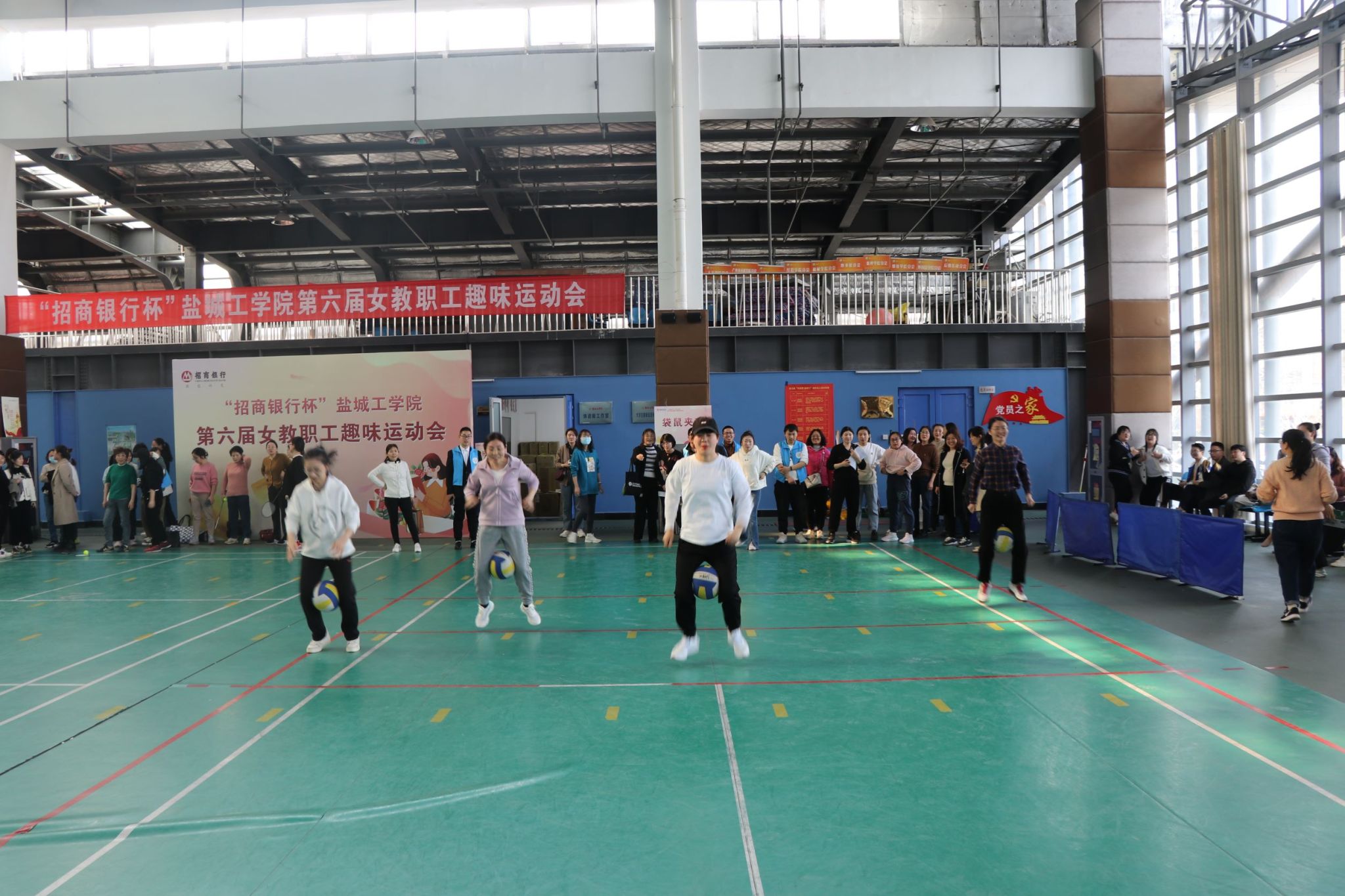 春风有信,花开有期,明媚春日下的南校区风雨操场热闹非凡,此起彼伏的欢笑声,加油声,呐喊声将这里变成了一片欢乐的海洋,来自全校28个分工会的400余名教职工齐聚一起,共庆第113个“三八”国际劳动妇女节。校工会主席谢毅敏、副主席吴旭、女教职工委员会主任周晓琴,赞助商代表招商银行盐城分行副行长纪新星等参加开幕式。吴旭主持开幕式。