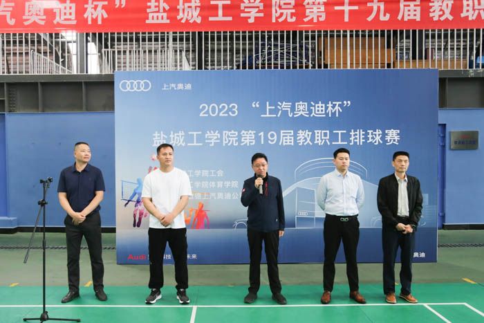 校党委副书记薛浩宣布“上汽奥迪杯”盐城工学院第十九届教职工排球赛开幕。体育学院党总支书记杨汉华主持开幕式,校工会副主席吴旭代表组委会讲话,盐城敬德上汽奥迪公司市场总监魏巨恒代表赞助商致辞,体育学院宁昌峰介绍比赛规则,人文学院刘高代表运动员宣誓,体育学院刘文方代表裁判员宣誓。