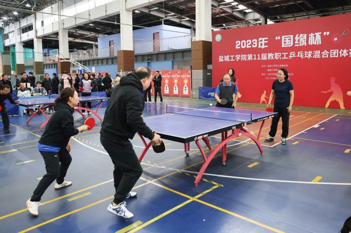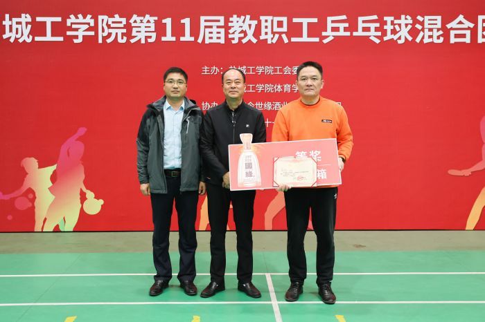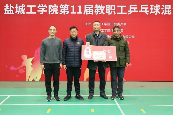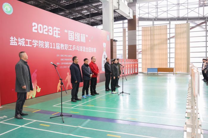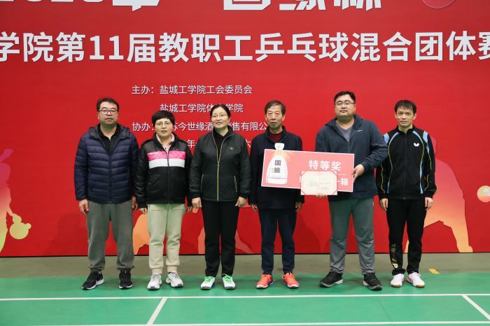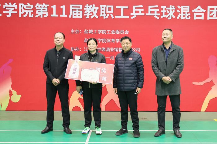 为积极推进全民健身运动,推进校园文化建设, 11月26日,我校在希望大道校区风雨操场举办了“国缘杯”第11届教职工乒乓球混合团体赛。党委书记方海林,校长、党委副书记邵荣,党委副书记薛浩,工会负责人、基建规划处处长廖大干,组委会副主任谢毅敏,体育学院党总支书记杨汉华、副院长仇乃民,江苏今世缘酒业销售有限公司盐城大区盐城市区办事处经理徐朋出席开幕式和颁奖仪式。方海林宣布比赛开始并为获特等奖队颁奖,邵荣、薛浩分别为获一、二等奖队颁奖。廖大干代表组委会讲话,他在讲话中充分肯定了广大工作人员、全体运动员为本次比赛所做的准备工作,赞扬了各分会运动员在赛前刻苦备战的态度,希望全体运动员奋勇争先、勇攀高峰,真正赛出风格、赛出友谊、赛出水平,充分展示教职工无限活力和青春风貌。徐朋代表赞助商致辞,仇乃民宣读《“国缘杯”盐城工学院第十一届教职工乒乓球赛竞赛规程》。杨善兵代表运动员宣誓,宁昌峰代表裁判员宣誓。杨汉华、谢毅敏分别主持开幕式和颁奖仪式。