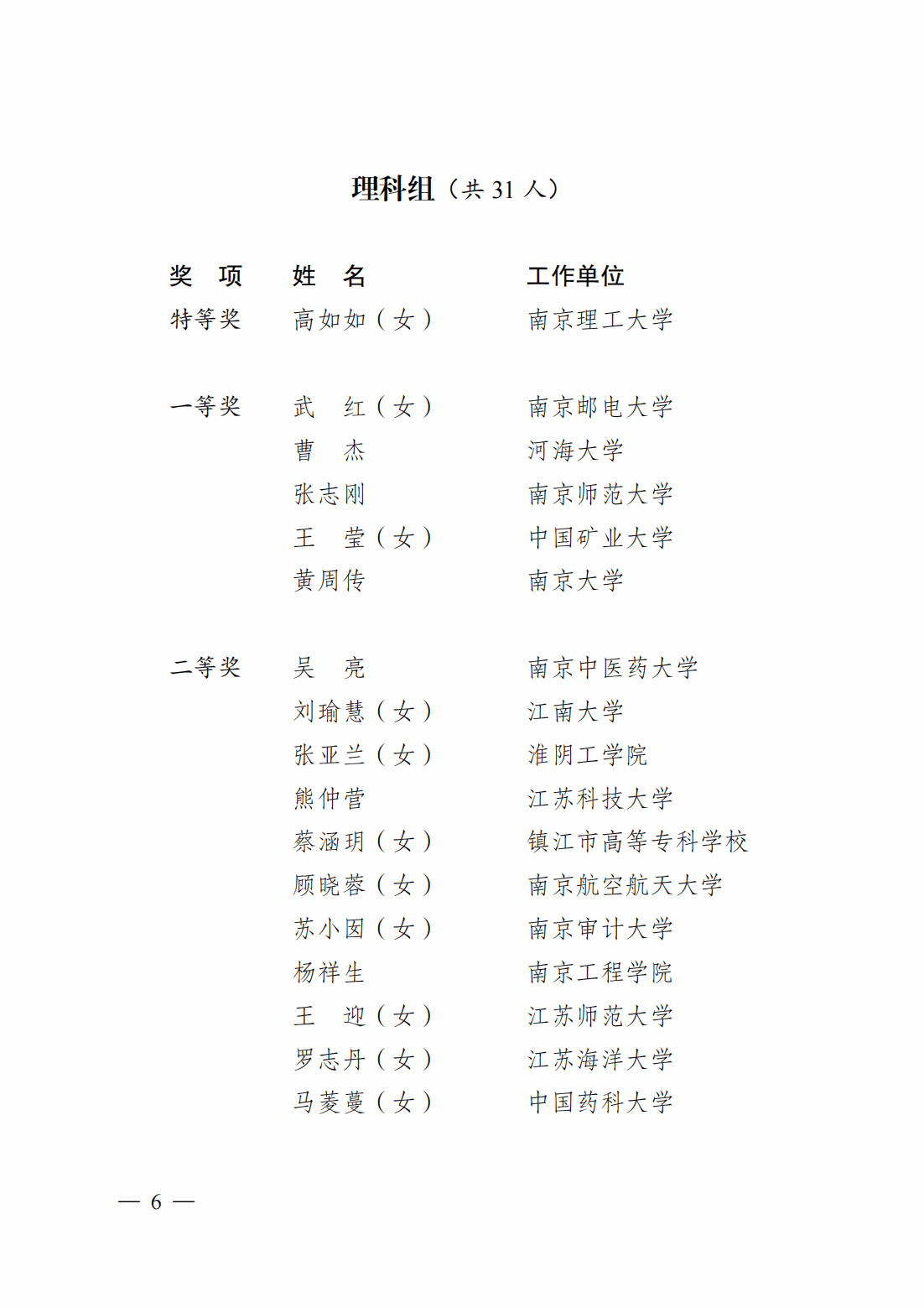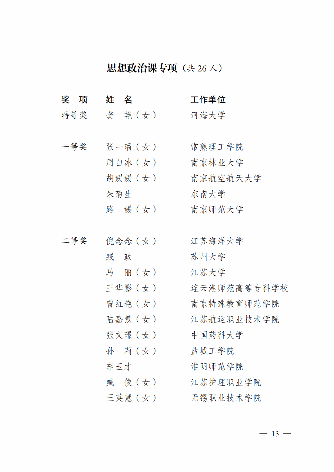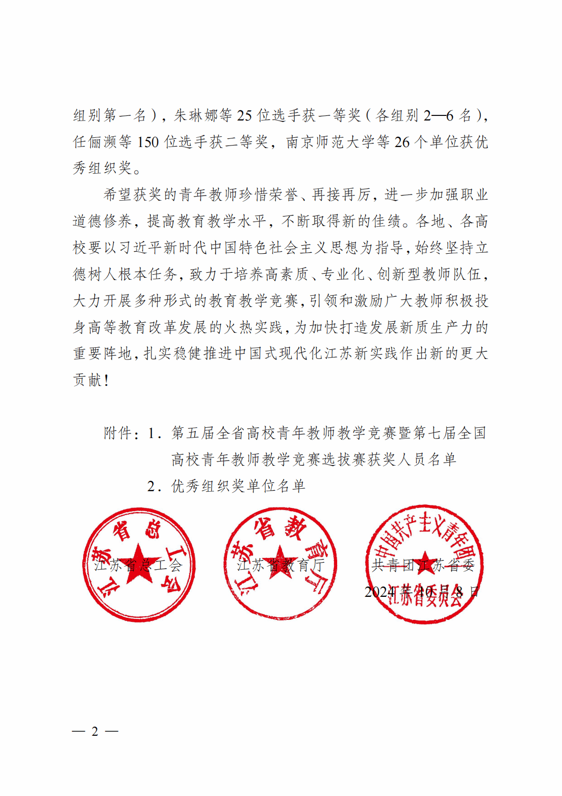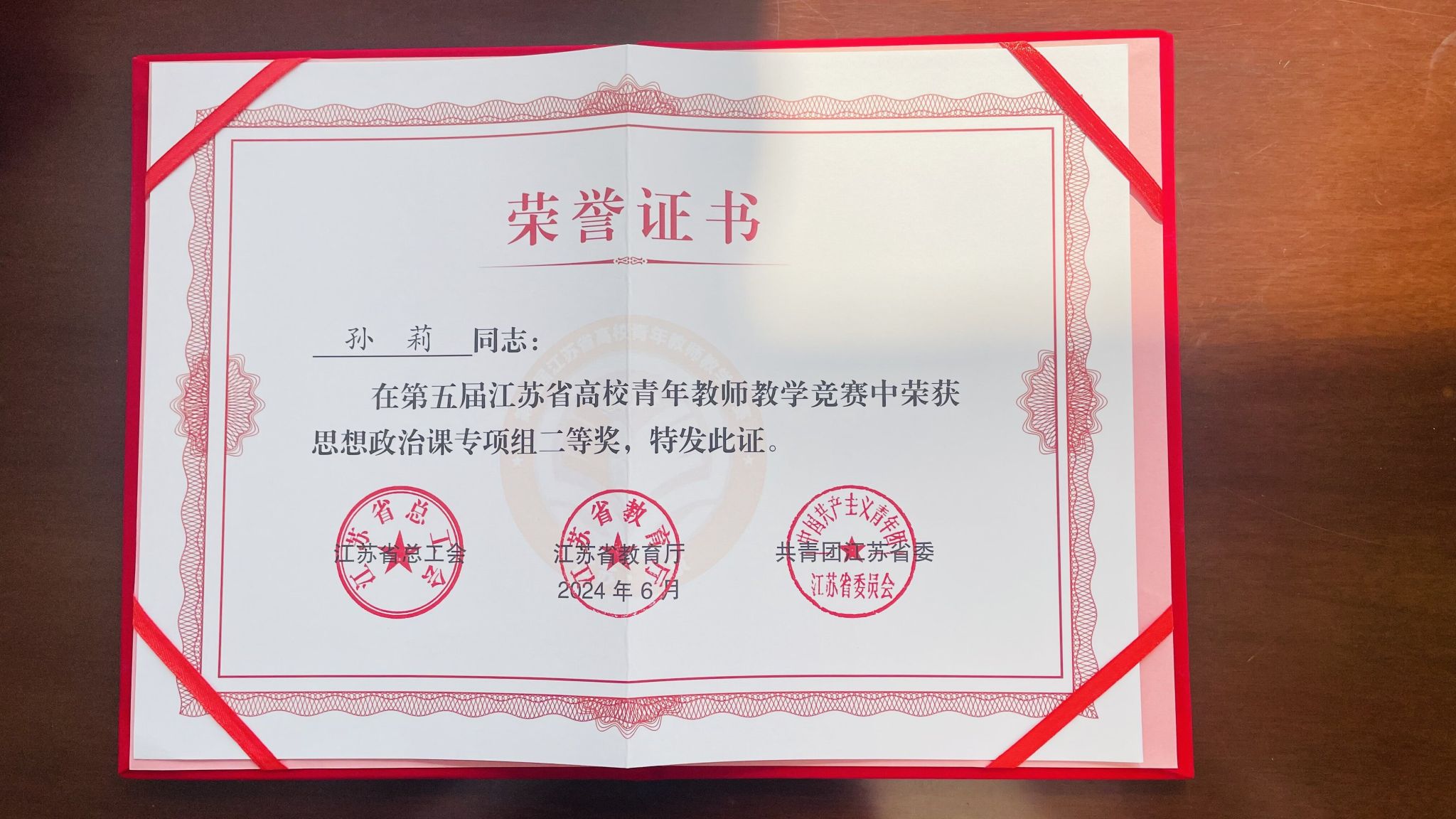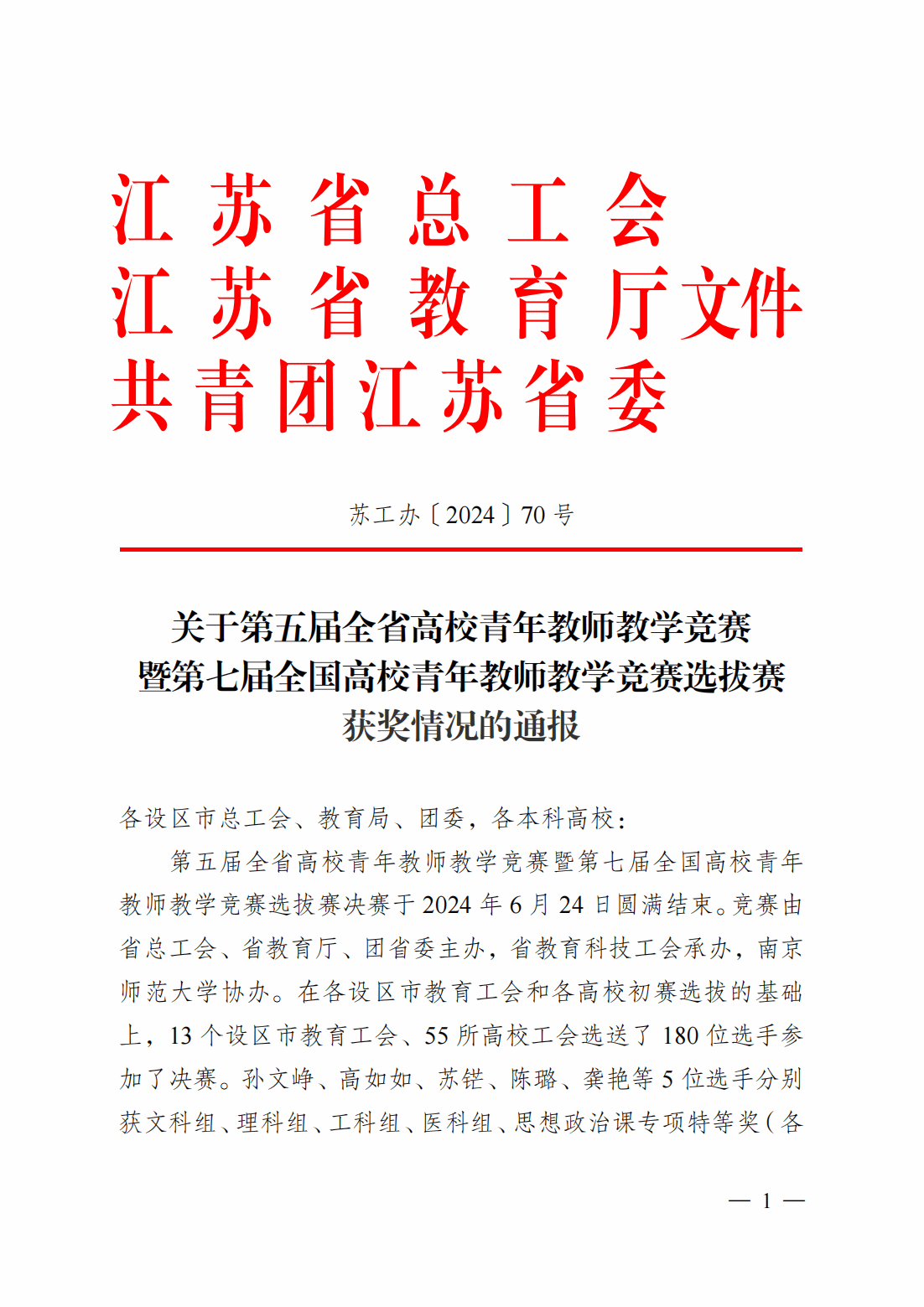 日前,省总工会、省教育厅和省共青团三部门联合发文(苏工办〔2024〕70号),通报第五届全省高校青年教师教学竞赛获奖情况,我校马克思主义学院孙莉、化学化工学院王文娟2位青年教师分别在比赛中获得思想政治课专项组和理科组二等奖。
