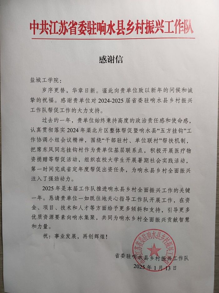 近日,学校收到了一封来自中共江苏省委驻响水县乡村振兴工作队的感谢信,信中对我校围绕“干部驻村、单位联村”帮扶机制,大力支持2024-2025届省委驻响水县乡村振兴工作队帮促工作、积极开展乡村振兴帮扶活动表示赞扬和充分的肯定。